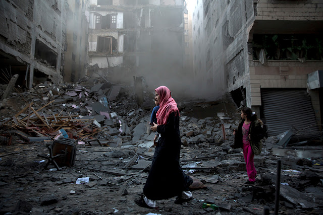 | Sebuah keluarga Palestina berjalan di sebelah bangunan perumahan yang hancur yang dilanda serangan udara Israel di Kota Gaza, Selasa (13/11/2018). KHALIL HAMRA / AP PHOTO |